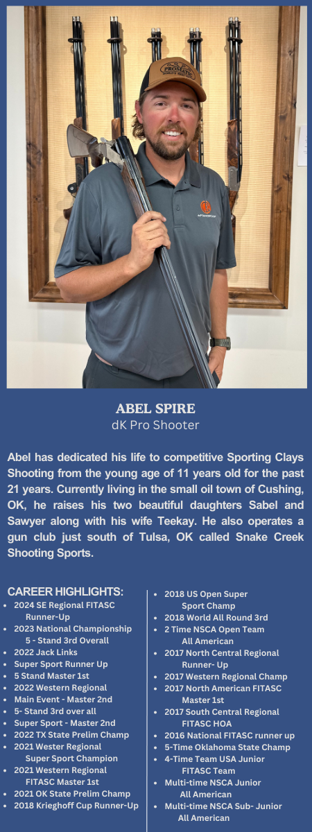 Abel has dedicated his life to competitive Sporting Clays Shooting from the young age of 11 years old for the past 23 years. Currently living in the small oil town of Cushing, OK, he raises his two beautiful daughters Sabel and Sawyer along with his wife Teekay. He also operates a gun club just south of Tulsa, OK called Snake Creek Shooting Sports.